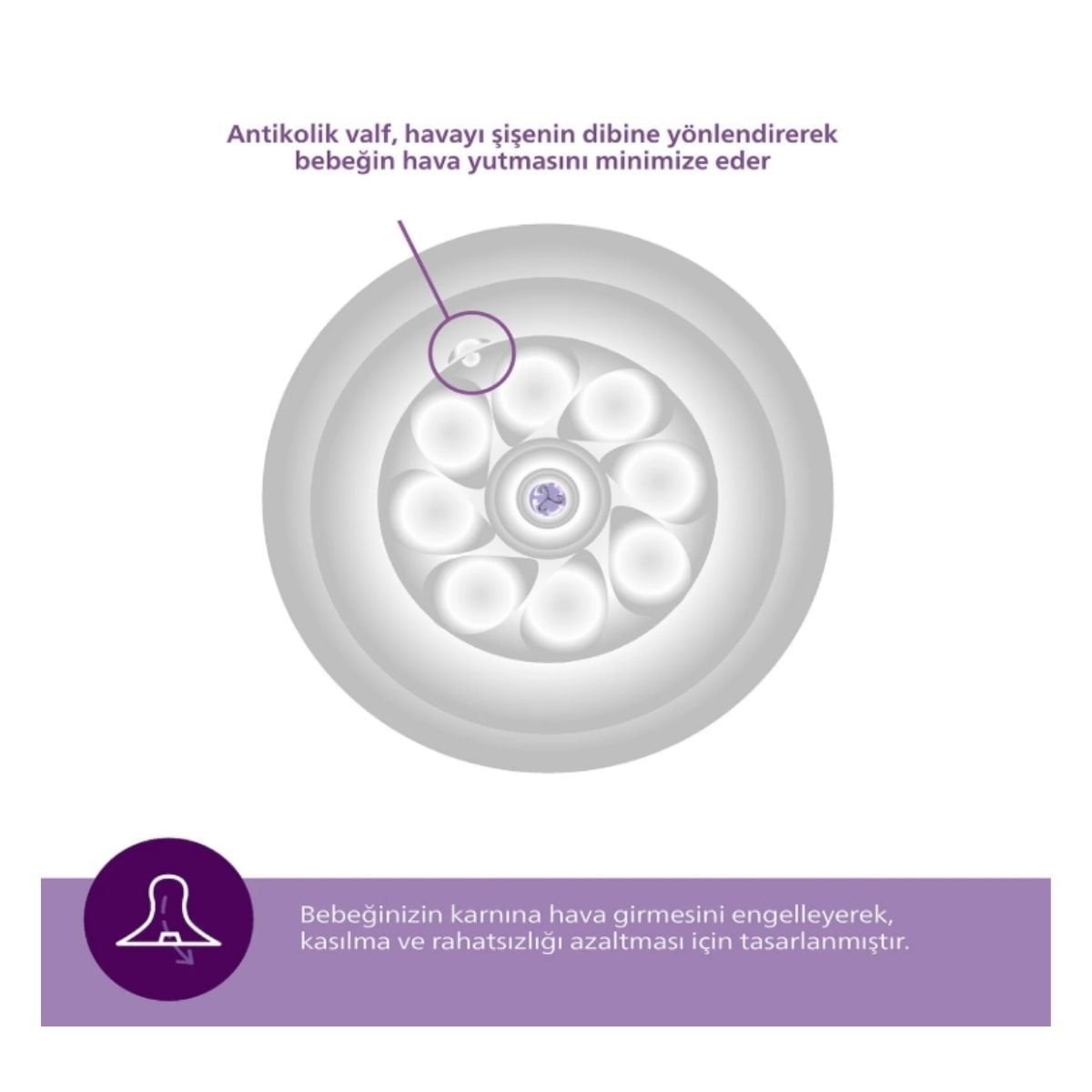 Anti-kolik Valf: Bebeğin hava yutmasını azaltarak kolik ve rahatsızlık riskini en aza indirmeye yardımcı olur.