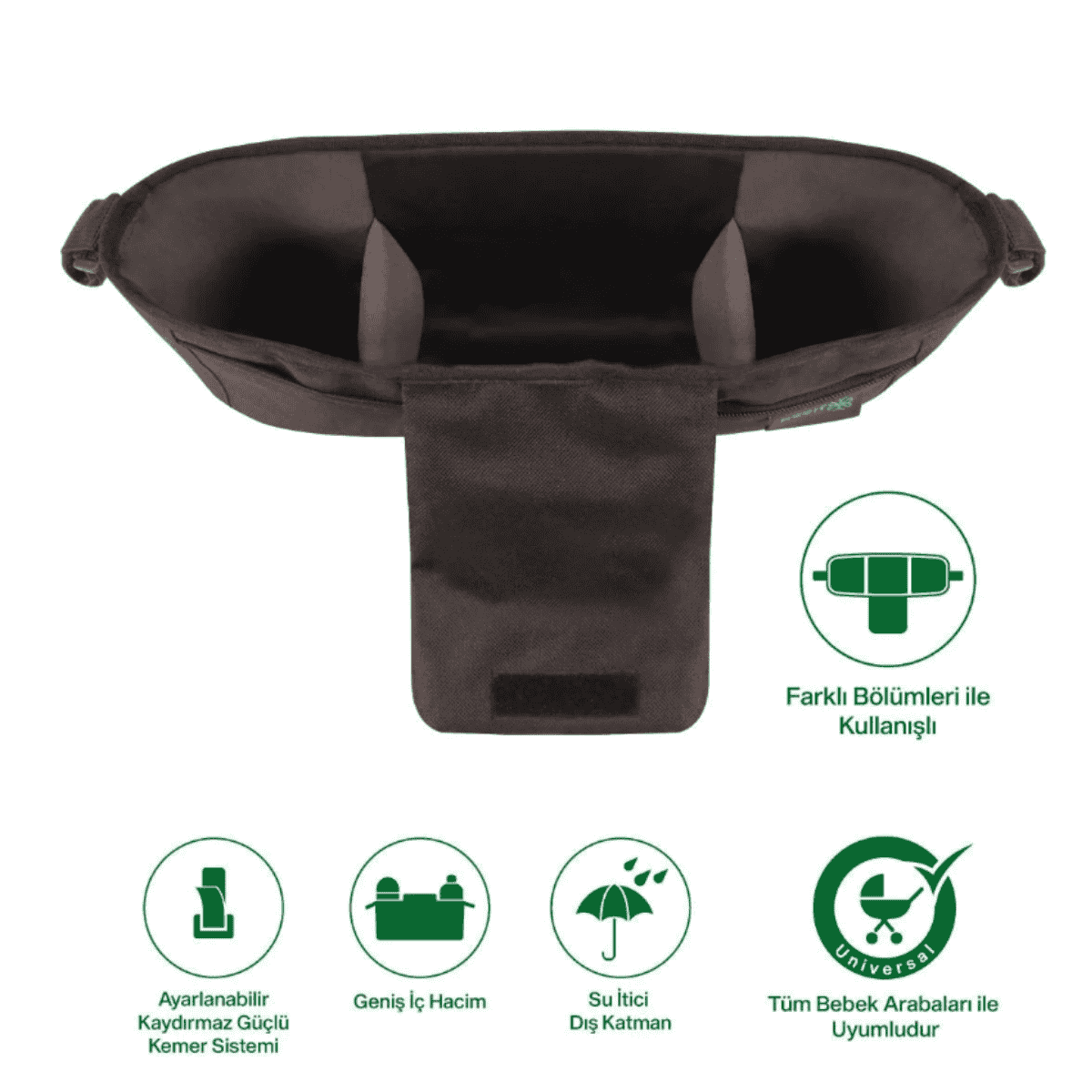 Organizer çanta, tüm bebek arabalarıyla uyumlu olacak şekilde ayarlanabilir cırt cırtlı askılarla tasarlanmıştır. Kolayca takılıp çıkarılabilir ve taşıma esnasında sarkma yapmaz. Pratikliğiyle öne çıkan bu model, aynı zamanda şık görünümüyle de tarzınızı yansıtır.