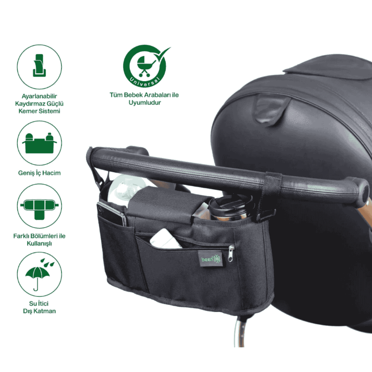 Been Bebek Arabası Organizer Çanta, bebekli hayatı kolaylaştırmak isteyen anneler ve babalar için özel olarak tasarlandı. Günlük gezilerde ya da uzun yürüyüşlerde ihtiyacınız olan her şeyi düzenli ve ulaşılabilir hale getirir.