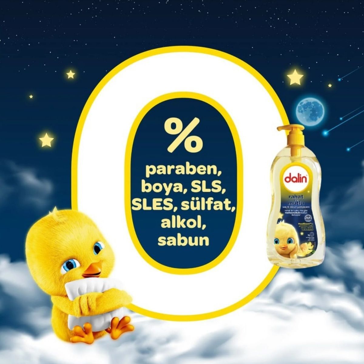 Dalin Şampuan Saç ve Vücut Rahat ve Mutlu 700 ml, içeriğinin %98'i doğal kökenli maddelerden oluşur. Cildi kurutmadan temizler, saçları yumuşak ve kolay taranabilir hale getirir. Paraben, boya, SLS, SLES, sülfat ve alkol içermez. Hipoalerjenik yapısı ile bebeklerin hassas cildi için güvenlidir.