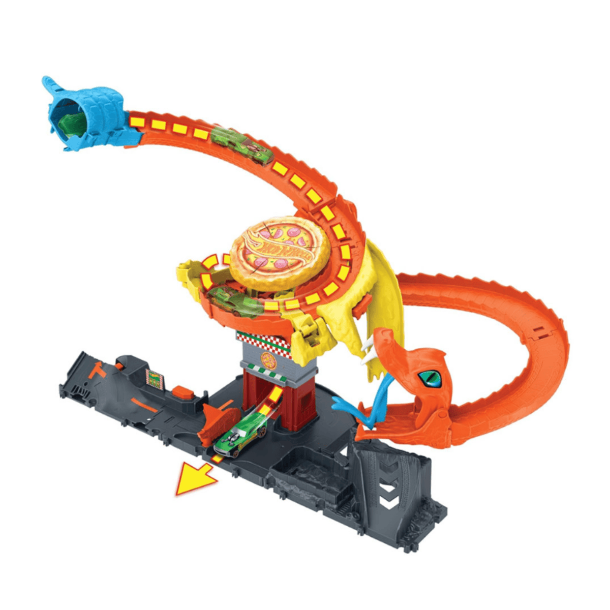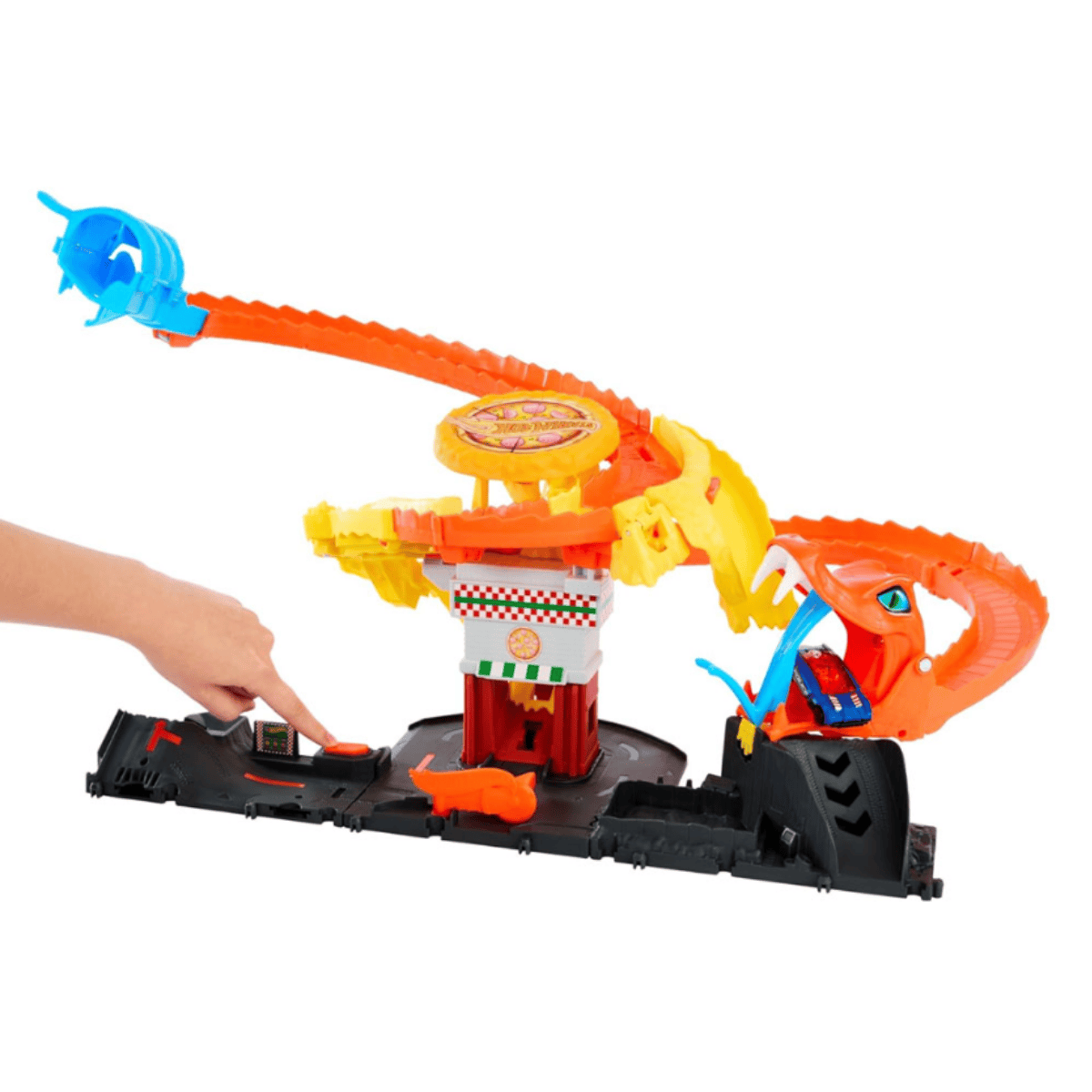 Hot Wheels Pizza Dükkanında Kobra Macera Seti, sıradan bir yarış pistinden çok daha fazlasını sunuyor! Bu set, çocukları hem eğlenceli bir hikâyenin içine çeker hem de aksiyon dolu anlar yaşatır. Setin merkezinde dev bir kobra yer alır ve bu dev yılan, Hot Wheels arabalarının pizza dükkanını kurtarma mücadelesinde baş düşmanı olur.