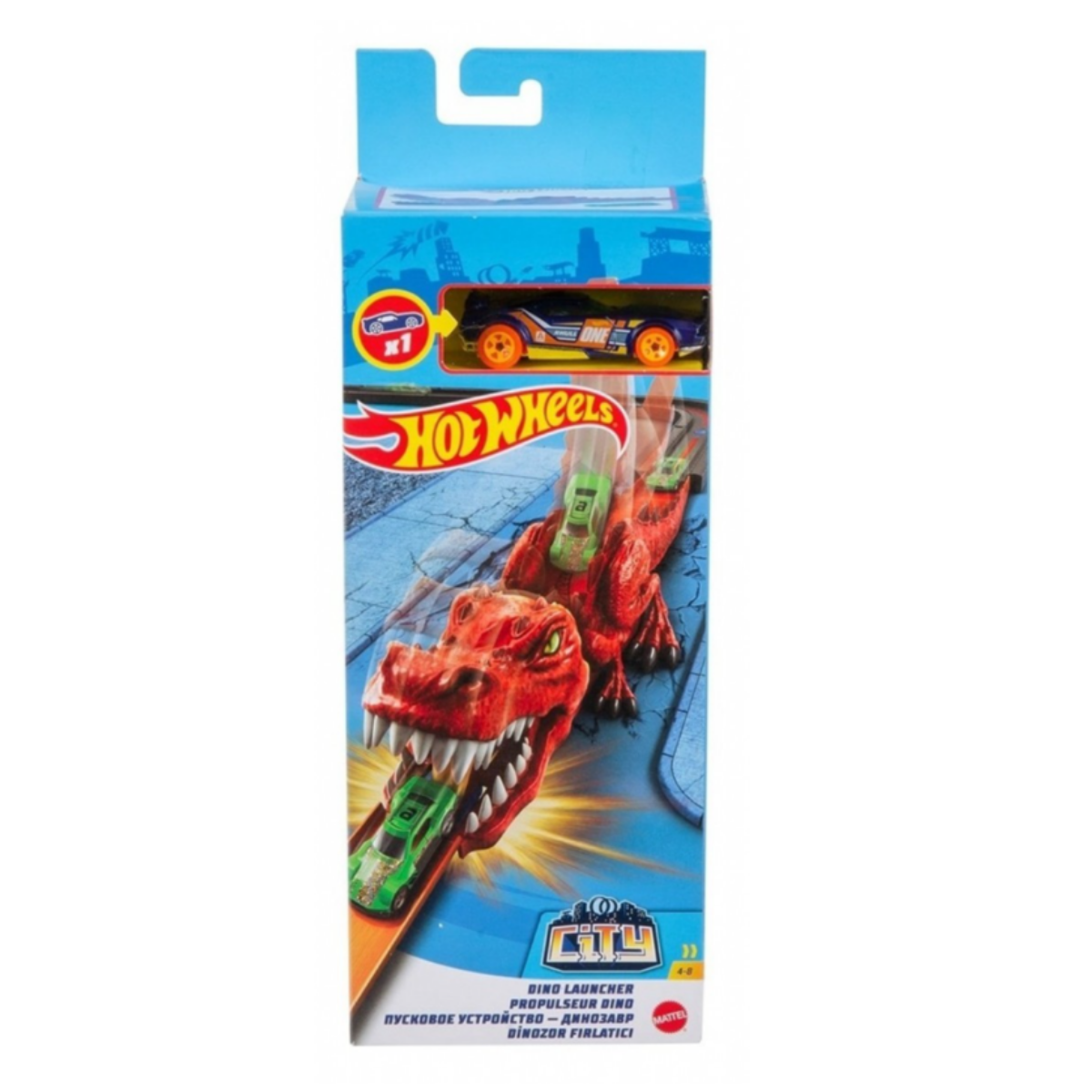 Hot Wheels Dinozor Fırlatıcı ve Hot Wheels Köpek Balığı Fırlatıcı, T-Rex ve köpek balığı şeklinde havalı fırlatıcılar ve Hot Wheels Şehri (Ayrı olarak satılır.) dünyasının zorluklarını içerir. Arabalarınızı yeterince güçlü fırlatmazsanız canavarların ağızlarına takılma riskiyle karşılaşırsınız.