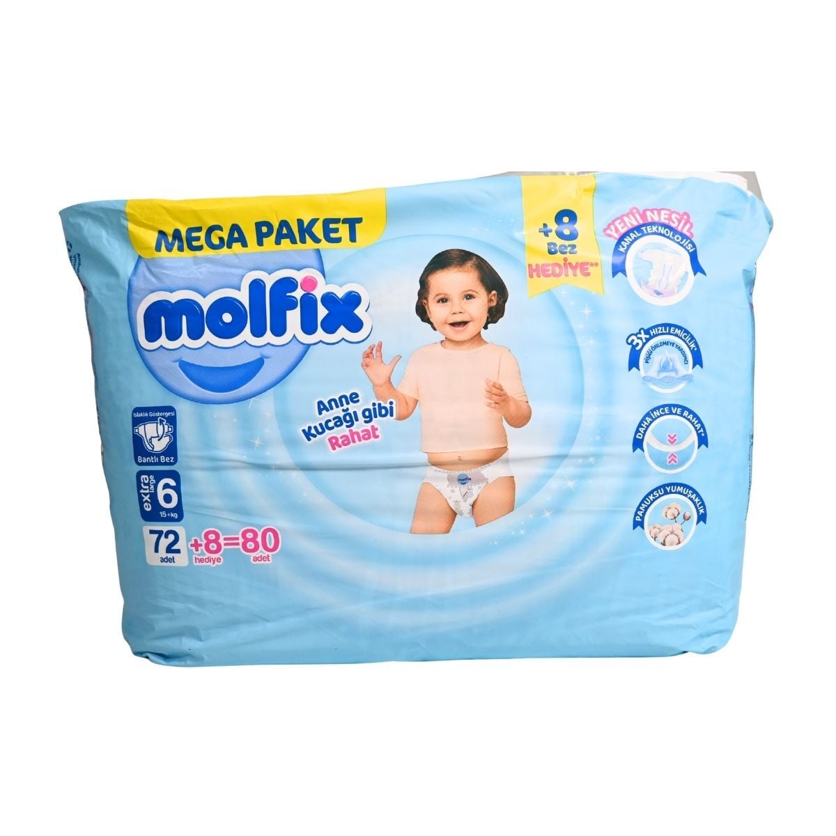 Ebeveynlerin Molfix 6 Mega Cırtlı Bebek Bezi 80'li ürününü tercih etmelerindeki en temel sebep, markanın sunduğu 3D teknoloji sayesinde sızdırmazlık ve kuruluk performansındaki yüksek başarıdır. Bebeğinizin dünyayı daha aktif keşfettiği bu süreçte Molfix 6 Mega Cırtlı Bebek Bezi 80'li kullanımı, hava kanallı yapısı sayesinde pişik oluşumunu engellemeye yardımcı olur. Molfix 6 Mega Cırtlı Bebek Bezi 80'li, yumuşacık ipeksi dokusuyla cildi tahriş etmez ve en hareketli anlarda bile çift katlı sızdırmazlık bariyerleri ile tam koruma sağlar. Pastel mavi ve beyaz tonların saflığıyla sunulan Molfix 6 Mega Cırtlı Bebek Bezi 80'li ürünlerimiz, hipoalerjenik yapısıyla Bebeym güvencesiyle sizlere ulaştırılır. Seçtiğiniz Molfix 6 Mega Cırtlı Bebek Bezi 80'li seçeneği, lateks, paraben ve BPA içermeyen formülüyle bebeğinizin sağlığını en az sizin kadar önemser. Bebeym olarak sunduğumuz Molfix 6 Mega Cırtlı Bebek Bezi 80'li seçenekleri, ebeveyn dostu bütçe planlamalarına destek olur.