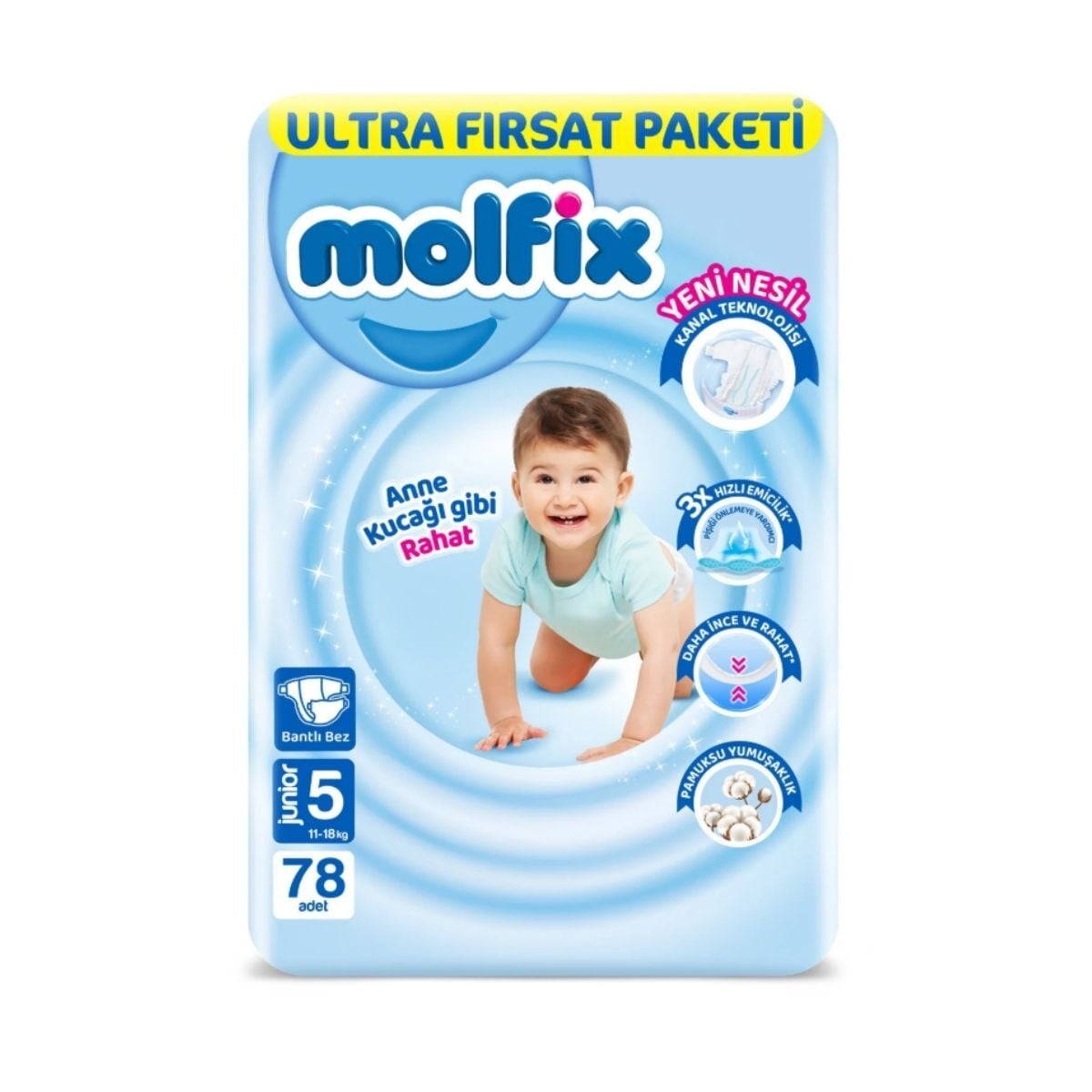Gelişmiş emici tabaka teknolojisi ile üretilen Molfix Ultra Fırsat Paketi 5/78 ve Ferah Temizlik Islak Mendil, bebeğinizin gün boyu kuru kalmasına yardımcı olabilir. Pakete dahil olan ferah temizlik ıslak mendili sayesinde Molfix Ultra Fırsat Paketi 5/78 ve Ferah Temizlik Islak Mendil, bebeğinizin hassas cildi için nazik bir temizlik sağlar.