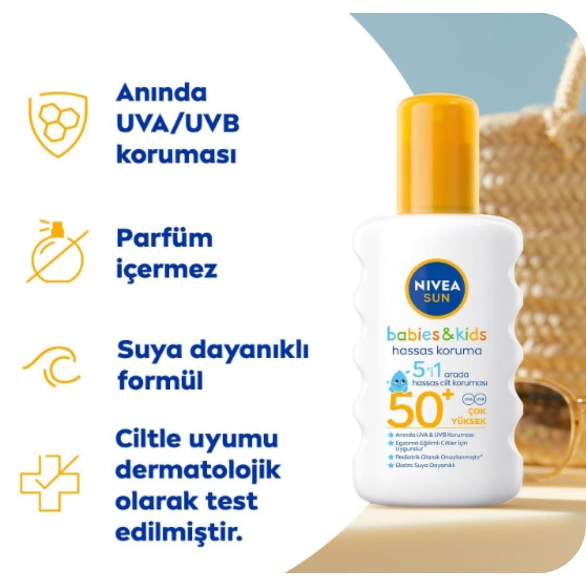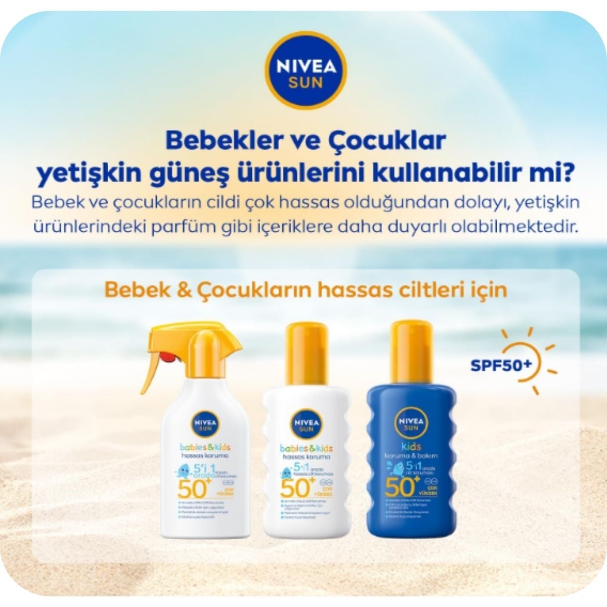 Bebek ve çocukların hassas cildi güneş ışınlarına karşı daha duyarlıdır. Nivea Sun Babies & Kids Hassas Koruma SPF 50+ 200 ml, yüksek koruma faktörü sayesinde çocukların cildini güneşin zararlı etkilerine karşı korumaya yardımcı olabilir.