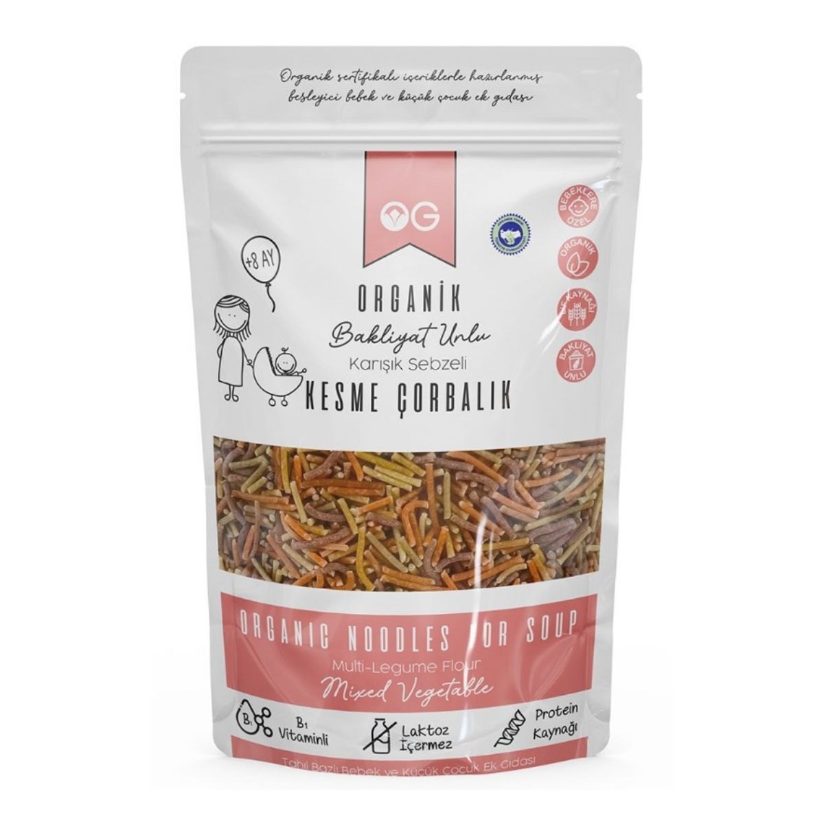 ORGANİK BAKLİYAT UNLU KARIŞIK SEBZELİ KESME ÇORBALIK İçindekiler: Bakliyat unu karışımı (%86,92) [organik kırmızı mercimek unu, organik yeşil mercimek unu, organik nohut unu, organik karabuğday unu], organik sebzeler (%13) [organik kapya biber püresi, organik ıspanak püresi, organik pancar püresi, organik zerdeçal püresi], B1 vitamini.
