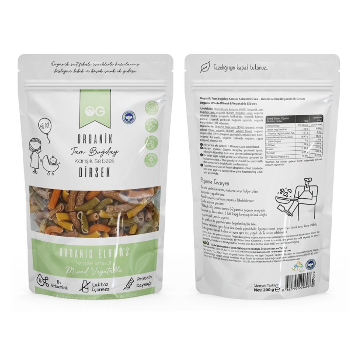 Bebeklerin ve çocukların en sevdiği makarna formlarından biri olan dirsek makarna, OG Organik dokunuşuyla tam bir vitamin deposuna dönüşüyor! Mevsiminde toplanan taze sebzelerin püre haline getirilerek organik durum buğdayı irmiği ile buluştuğu bu özel ürün, hiçbir koruyucu, katkı maddesi veya gıda boyası içermez.