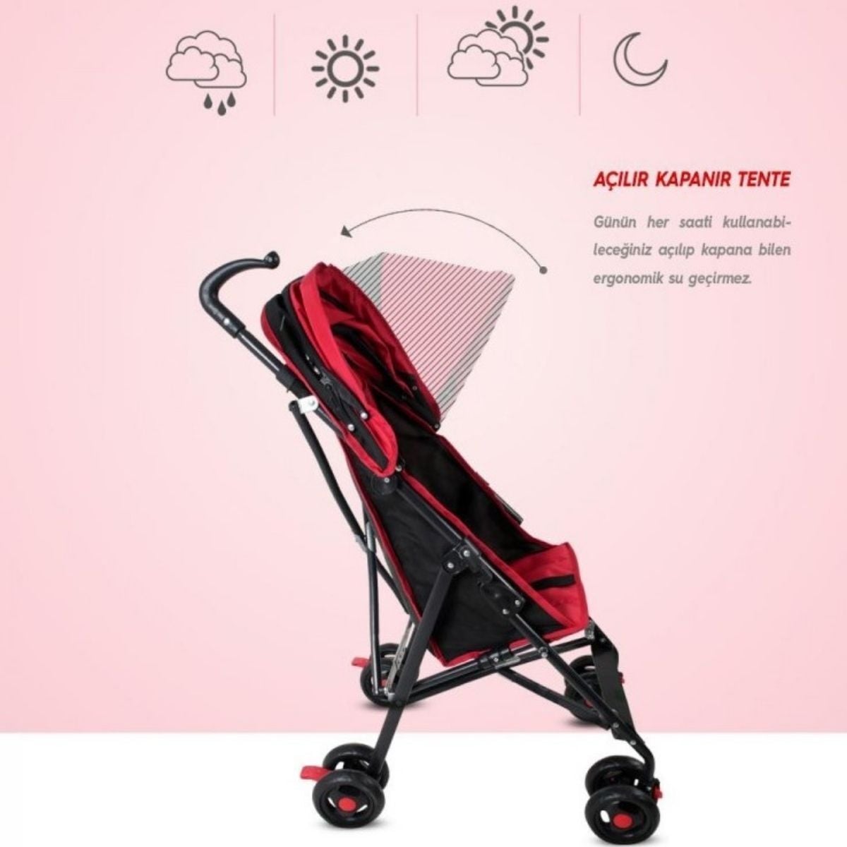 Güneşlik ve Rüzgarlık: Kademeli ayarlanabilen tentesi sayesinde bebeğinizi dış etkenlerden korur.