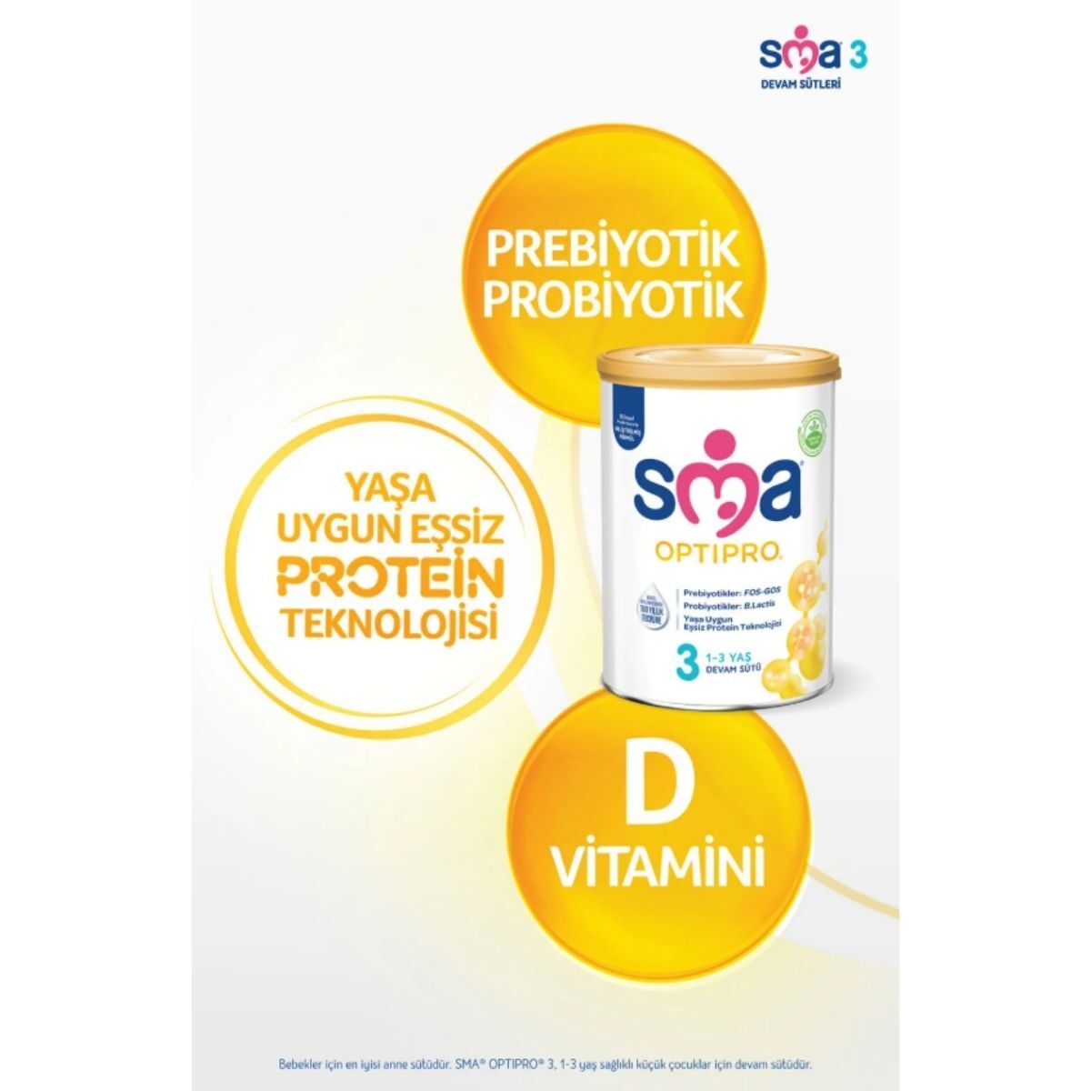 Bebeklerin 1 yaşından itibaren artan hareketliliğine ve keşif merakına yanıt veren SMA 3 Numara Optipro Probiyotik Devam Sütü 400 gr, Nestlé’nin protein teknolojisi ve probiyotik desteği ile özel olarak geliştirilmiştir. Küçük keşifçilerin enerji seviyelerini destekleyen SMA 3 Numara Optipro Probiyotik Devam Sütü 400 gr, içeriğindeki yaşa uygun protein kalitesi (Optipro) ve aktif probiyotik kültürü sayesinde çocuğunuzun sağlıklı büyüme serüvenine eşlik eder. 400 gramlık kompakt boyuyla SMA 3 Numara Optipro Probiyotik Devam Sütü 400 gr, hem seyahatlerde taşıma kolaylığı sağlar hem de ürünün her zaman taze kalmasına yardımcı olur. Mağazamızda sunduğumuz SMA 3 Numara Optipro Probiyotik Devam Sütü 400 gr, içeriğindeki temel vitaminler, mineraller ve demir desteğiyle 12 ay üzerindeki çocukların bağışıklık sistemini güçlendirmeyi hedefler. Kaliteli bir SMA 3 Numara Optipro Probiyotik Devam Sütü 400 gr edinmek, çocuğunuzun büyüme ataklarında ona probiyotik katkılı, güçlü bir besin partneri sunmanın en profesyonel yoludur.