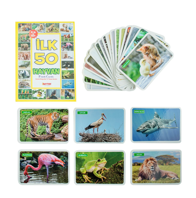 Yaşam Alanlarında İlk 50 Hayvan Kartları ile minikler eğlenerek öğrenecekler! Bebeğinizin, İlk 50 Hayvan Flash Card’ları sayesinde adımadım hayvanları gerçek hayatla bağlantılı olarak nasıl eğlenceli ve kolayca öğrendiğini gözlemlemiş olacaksınız. Üstelik hayvanların yaşam alanlarındaki fotoğrafları sayesinde çocuklar hayvanları ve yaşadıkları coğrafyayı daha yakından tanıyacaktır. Flash card, eğitim sisteminde öğrencilerin çokça kullandığı, öğrenmeyi kolaylaştıran bir yöntemdir. Genelde soru-cevap biçiminde kullanılır. Yapması da çok kolaydır. Elinizdeki kartların üzerinde çocuğunuzun öğreneceği kavramlar yer almaktadır. Çocuğunuza kartları birer birer göstererek nesnelerin isimlerini söyleyin ve bunu çok kere tekrarlayın. Daha sonra nesneleri işaret ederek "Bu ne?" diye isimlerini sorun. Bu süreci tekrarlayarak çocuğunuza yeni kavramlar ve sözcükler öğreterek konuşmaya adım atmasına yardımcı olabilirsiniz. Ürünlerinin tamamı AB standartlarına çocuk sağlığı ve güvenliğini gözeterek üretilmiştir.