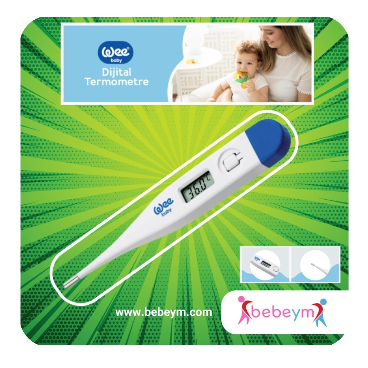 Değerli ebeveynler, bebeğinizin sağlığını yakından takip etmek, özellikle hastalık dönemlerinde büyük önem taşır. Bebeym.com olarak, bu süreçte size güvenilir bir yardımcı sunmaktan mutluluk duyuyoruz: Wee Baby Dijital Termometre! Hızlı ve hassas ölçüm özelliği sayesinde bebeğinizin ateşini kolayca ve doğru bir şekilde takip edebilir, onların sağlığı hakkında anında bilgi sahibi olabilirsiniz.