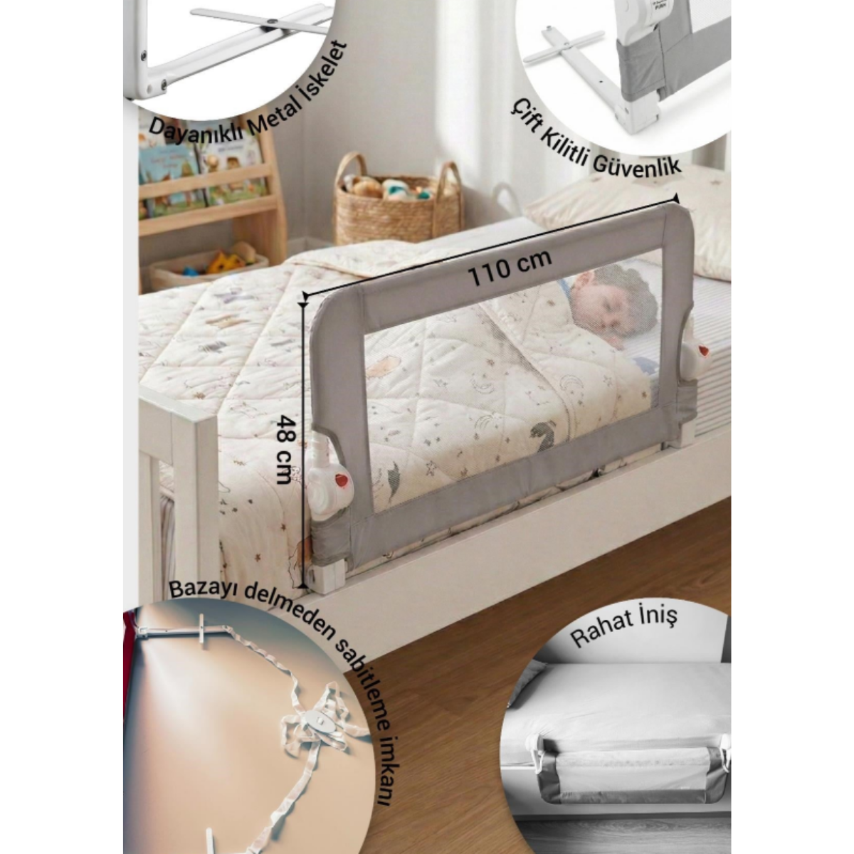 Bebeğinizin yetişkin yatağına geçiş sürecinde hem güvenliği hem de oda dekorasyonunu düşünen ebeveynler için Wellgro Littles 110*48 cm Yatak Bariyeri Gri, şimdi Bebeym stoklarında! Dayanıklı metal aksamı ve esnek koruma sağlayan soft file dokusuyla öne çıkan Wellgro Littles 110*48 cm Yatak Bariyeri Gri, uyku sırasında düşme riskini tamamen ortadan kaldırır. Sadece 1 kg ağırlığına rağmen yüksek mukavemet gösteren Wellgro Littles 110*48 cm Yatak Bariyeri Gri, tek bir buton hareketiyle 180 derece katlanarak yatağa giriş çıkışlarda size büyük kolaylık sağlar. Bebeym’in Serik mağazamızdaki tecrübesiyle sunduğumuz bu bariyer, bazayı delmeden sabitleme imkanı sunan özel kordonu ve mobilyalı yataklara tam uyumlu tasarımıyla kurulumda özgürlük tanır. En kaliteli Wellgro Littles 110*48 cm Yatak Bariyeri Gri modelini edinmek, güvenli uykuları modern bir dokunuşla Bebeym güvencesiyle sağlamanın en pratik yoludur.